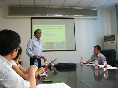 学术交流期间,Krishnaswamy教授为我校师生做了题为激光超声无损检测和结构健康智能监测的精彩学术报告,系统深入地介绍了激光超声建模和可靠性评价理论,其研究工作前沿新颖,学术报告生动风趣,给予广大师生重要的科研启发,受到一致好评。来访期间Krishnaswamy教授还与院、系领导进行了广泛研讨交流,徐春广教授介绍了先进加工技术国防重点学科实验室在超声无损检测领域的研究成果,双方就相关学术合作问题进行了深入探讨。