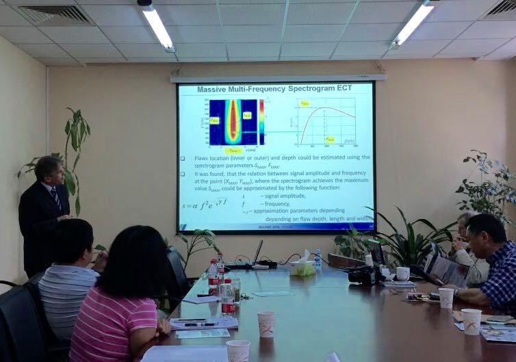6月25日下午,Terry Clausing教授与Tomasz Chady教授参观了机械与车辆学院检测与控制研究中心。6月26日上午,Terry Clausing教授作了题为《热分析:状态监测与无损检测》(Thermal Analysis: Condition Monitoring and Nondestructive Testing)的学术报告,分别介绍了红外热成像无损检测技术在电力、制造和军事等行业中的应用,并向师生展示和指导使用微型红外摄像机检测军用直升机某种内壁材料中液体的位置。Tomasz Chady教授作了题为《电磁无损检测技术的数据融合》(Fusion Of Data From Electromagnetic Methods of NDT)的学术报告,分别介绍了大规模多频光谱电涡流检测技术、电磁测量与检测技术、VFLM交流矢量漏磁检测技术与时域太赫兹光谱学和高动态范围X射线检测技术的原理、数据融合与应用。两位教授回答了师生提出的问题,开拓了师生在无损检测研究领域中学术视野。