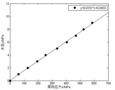 | Figure 4 shows that the water pressure has a linear relation with circumferential residual stress, in conformity with the formula (1), and the detection error is less than 3%. |