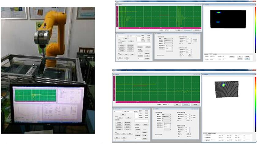 | The robotic scanning NDT system has solved those questions in the industrial application and has the capability to inspect arbitrarily specimen with complex shapes, the core-component technology has also been mastered such as robotic trajectory planning and motion control for complex structures, acquisition of signal synchronize between the ultrasonic / eddy current information and the robotic position, signal process and data visualization etc. |
