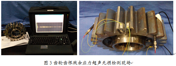 齿轮齿根残余应力超声无损检测系统是基于超声临界折射纵波原理。该系统针对齿根部位连续变化的曲率半径,设计了特殊的齿根残余应力检测楔块。同时,对超声临界折射纵波在齿根处的传播模式进行分析,建立了两发两收的齿根专用软硬件检测系统。图3为检测现场。