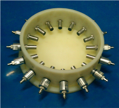 液体超声阵列由环形排列于容器外壁的16个水浸式超声换能器组成,每个换能器兼具发射与接收的功能。通过对超声波的声速、衰减和散射等物理特性的测量,来表征被测液体的颗粒度、粒度分布、浓度,并可实现液体内单个颗粒和多个颗粒的层析成像。