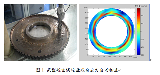 焊接残余应力如果过大,则会对机械构件造成严重影响,对国家造成无法估计的损失。航空航天装备都含有大量的焊接件,如飞机机翼、火箭外壳等,它们所处环境十分恶劣,如果焊接残余应力过大,则焊缝很容易出现开裂甚至是断裂。因此,通过准确地测量出残余应力,并对其状态、应力值进行合理的评估,对采取措施消除残余应力具有十分重要的意义。图1是我国某型航空涡轮盘残余应力超声自动扫查和应力分布图。